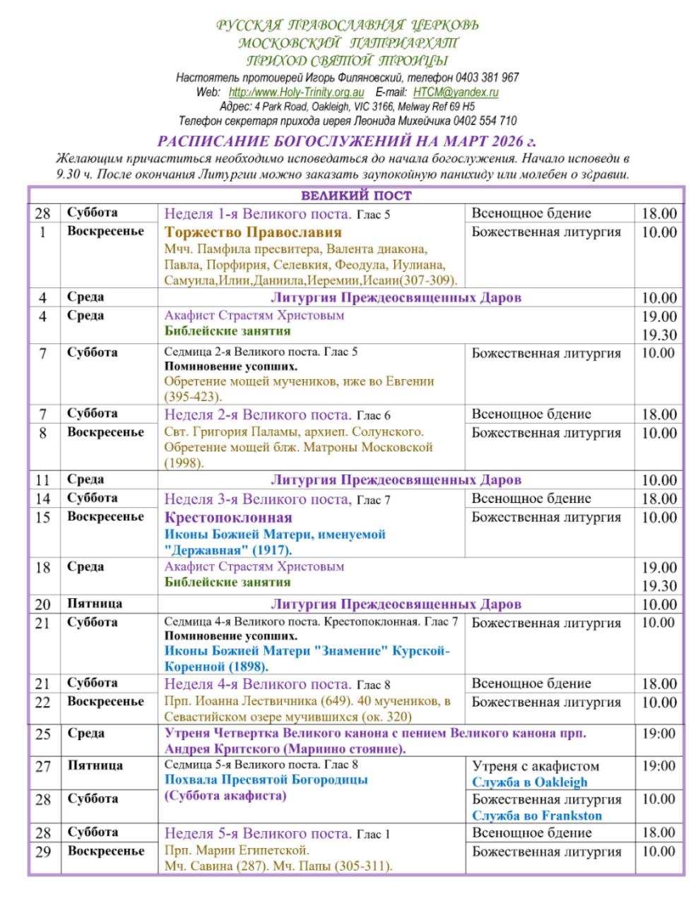 РАСПИСАНИЕ БОГОСЛУЖЕНИЙ НА Март 2026